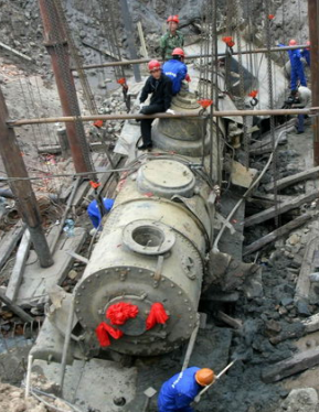 為了進一步對機車進行研究,有關(guān)單位負責(zé)人員決定將機車打撈上來,施工現(xiàn)場,工人在火車兩邊搭建了幾根承重架子形成結(jié)實緊固的門形架,并在架子上懸掛了幾臺手拉葫蘆,葫蘆拉動車體緩緩上升,在拉動過程中,有兩臺葫蘆出現(xiàn)過故障,工作人員換上備用葫蘆后繼續(xù)扶正起吊火車。最后將其平安起吊了地面上。